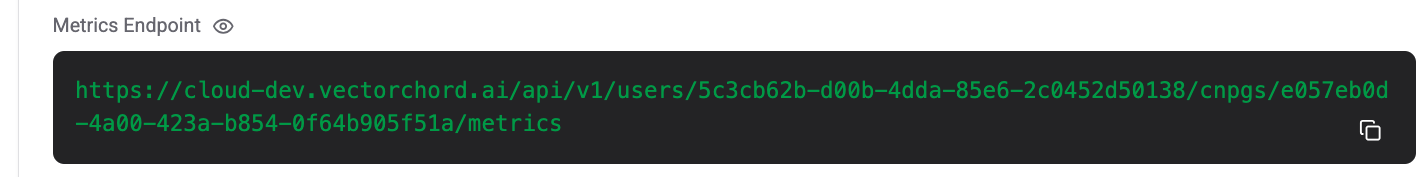 You can find your metrics on your database’s domain name with the metrics endpoint. You must provide a VectorChord Cloud API Key in order to access these metrics. You can generate a API Key from the API Keys section.