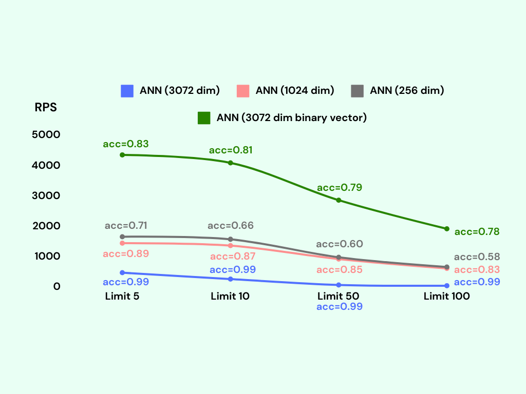 Regarding the Requests Per Second (RPS) metric, the binary vector index showcases the most efficient performance, followed by the 256-dimensional embeddings, the 1024-dimensional embeddings, and finally, the 3072-dimensional embeddings.